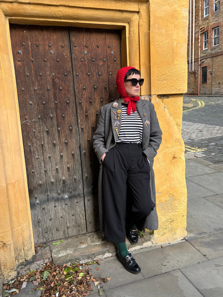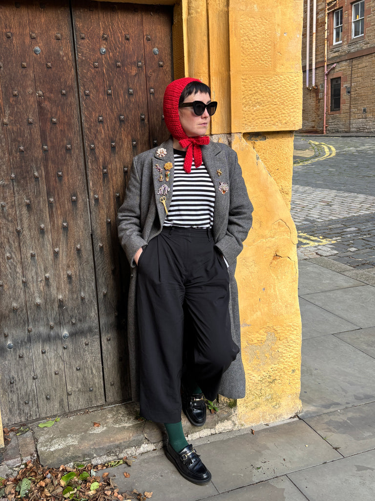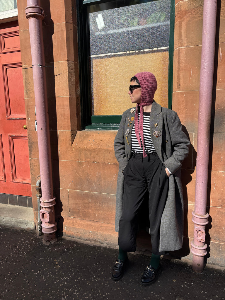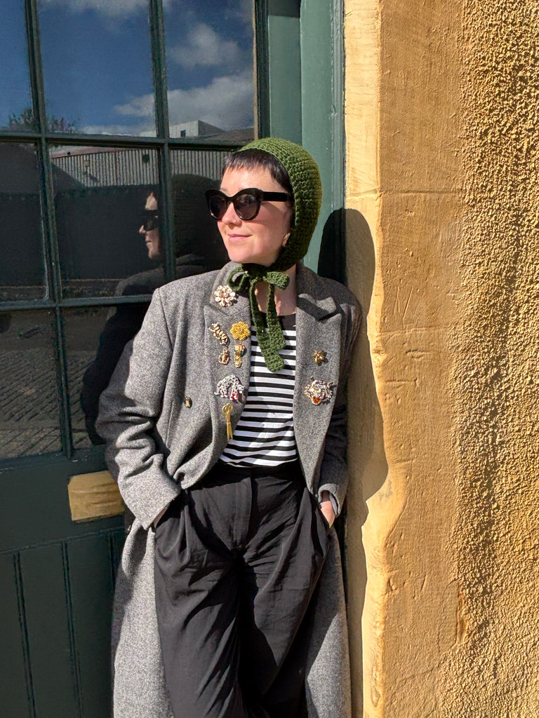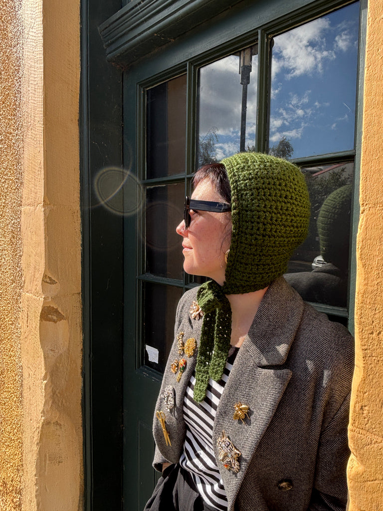 100% wool lightweight bonnet with tie. Perfect for the cooler months. Super cute and wearable.